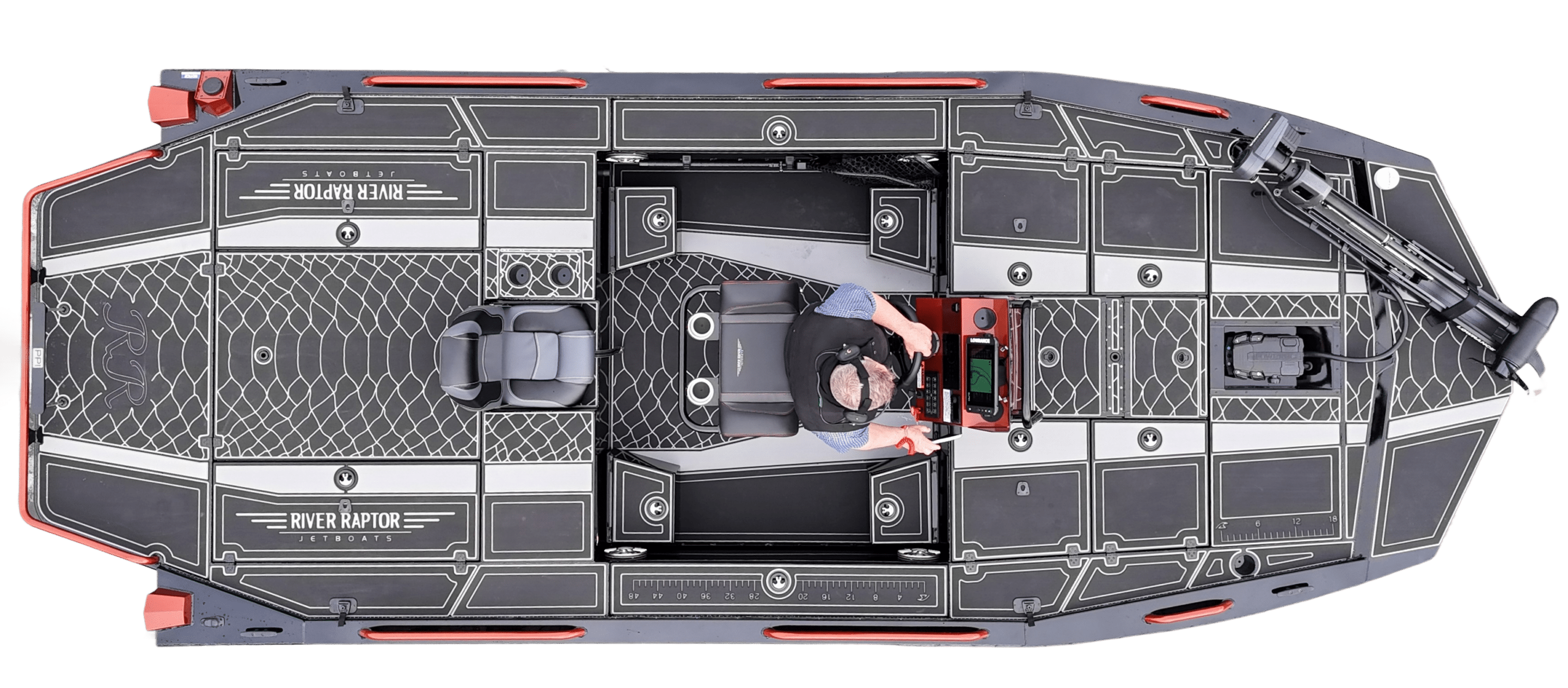The River Raptor Vortex blends modern hull engineering with classic Mercury or Honda outboard tunnel jet power to create a versatile, high-performance fishing platform that runs extremely shallow without sacrificing durability or serviceability. Featuring huge, elevated fishing decks, abundant rod and gear storage, and plenty of customization options—from custom leaner seating to protective bottom coatings and marine flooring packages—the Vortex delivers River Raptor ruggedness and style with the flexibility and dependability anglers expect from a premium outboard-powered boat.